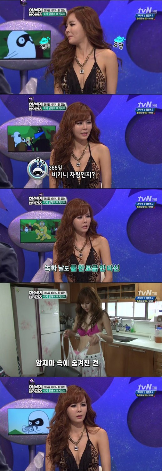 호피무늬 비키니 차림으로 출현, 등장과 동시에 MC들을 놀라게 한 비키니녀는 스튜디오와 집이 가까워 집에서부터 비키니차림이었다며 "주변인들의 시선이 부담스럽지 않나?"라는 질문에 "난 앞만 보고 오는 스타일이다. 신경 안 쓴다"라며 대수롭지 않다는 반응을 보였다.