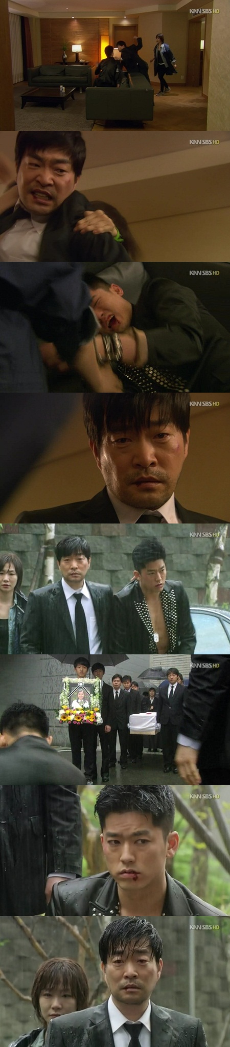 PK준은 이미 강동윤과 손을 잡고 일단 순순히 백홍석에게 끌려갔다. 백홍석은 딸 백수정과의 약속대로 발인 전에 PK준을 잡았다. 백홍석은 딸 앞에 PK준을 무릎 꿇게 한 후 "이번에는 약속 지켰다. 수정아. 미안하다"고 눈물 흘렸다. (사진=SBS 월화드라마 '추적자')