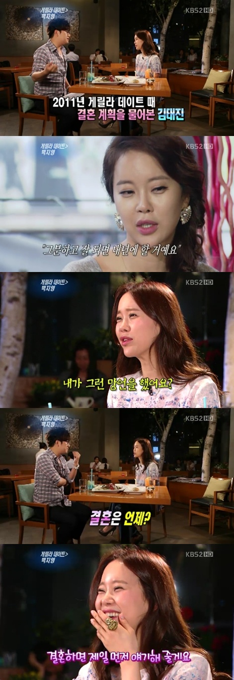 이날 리포터 김태진은 백지영에게 "지난 2011년 게릴라 데이트 때 기억나냐"며 백지영의 결혼계획을 넌지시 물었다.
