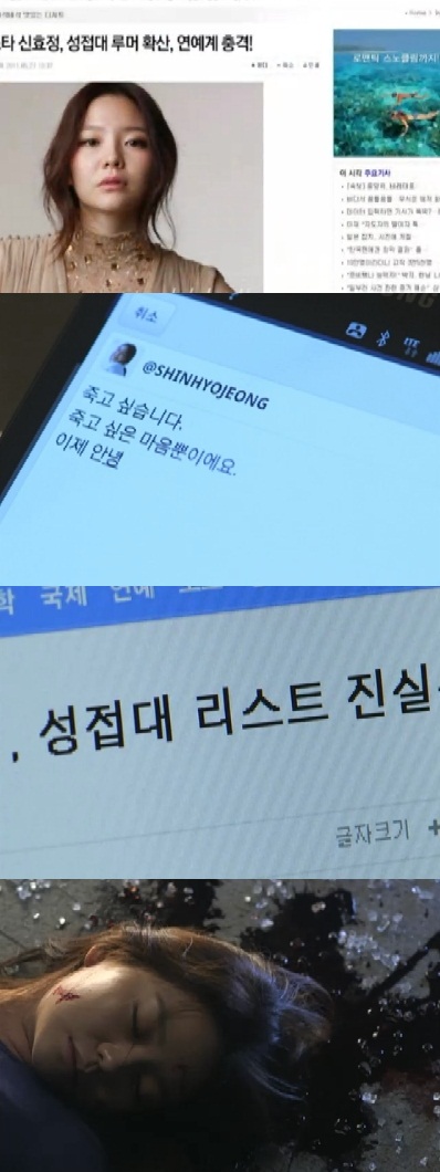 극 중 추락사 한 것으로 전해진 신효정(이솜 분)은 연예인 성접대 파문 리스트에 올랐고 '죽고 싶습니다. 죽고 싶은 마음뿐이에요. 이제 안녕'이라는 문자를 남기고 세상을 등졌다.