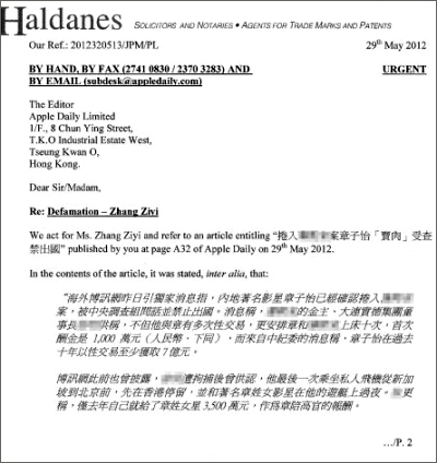 중국 다수 매체는 장쯔이측 법률자문을 인용, 영화배우 장쯔이가 대만 핑궈일보(萍果日報, 에플데일리) 등을 상대로 사과문 게재 등의 조치를 요구했다고 29일 밤 보도했다.