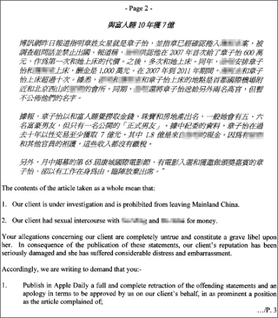 장쯔이 측은 보도와 관련, "조사를 받고 있고 출국이 금지됐다", "보시라이 및 쉬밍에게 돈을 받고 성거래를 했다" 등 "완전히 사실 무근이고 중상모략으로 명예에 심각한 피해를 입혔다"며 "또렷이 보이는 지면으로 명예훼손을 인정하는 성명과 사과문을 게재해야한다"고 법률자문을 통해 전했다고 중국매체들서 보도했다.