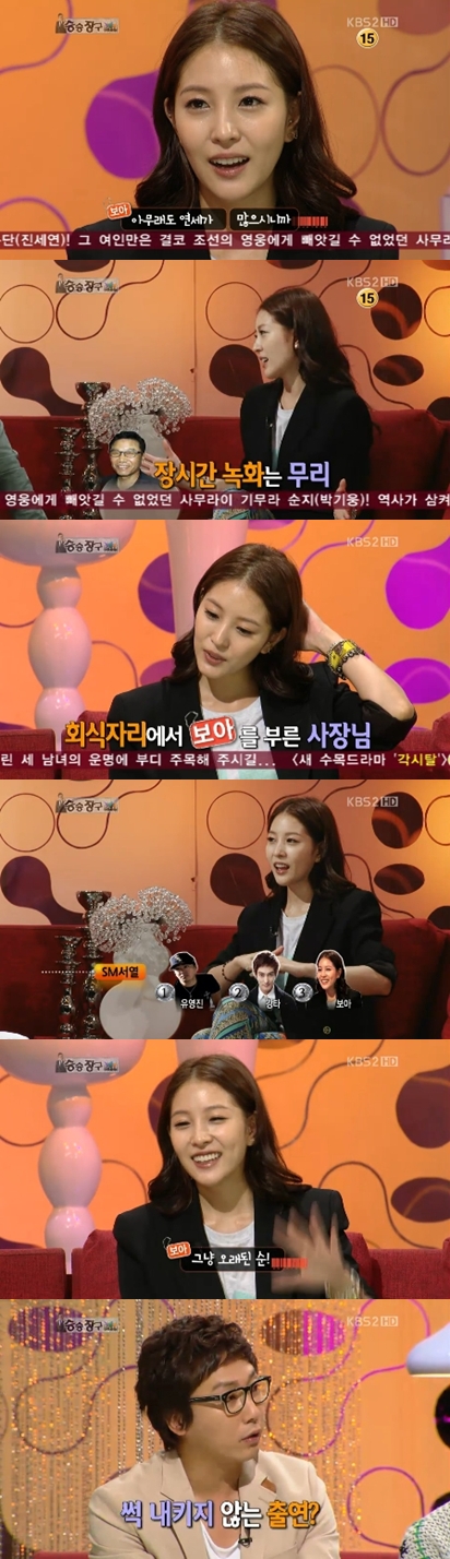 이날 보아는 SBS '일요일이 좋다-K팝스타'에 이수만 사장이 아닌 보아가 나선 이유에 대해 "아무래도 연세가 많으시니까"라고 말해 웃음을 자아냈다. 이어 보아는 "장시간 녹화다"라고 덧붙여 장내를 웃음바다로 만들었다.