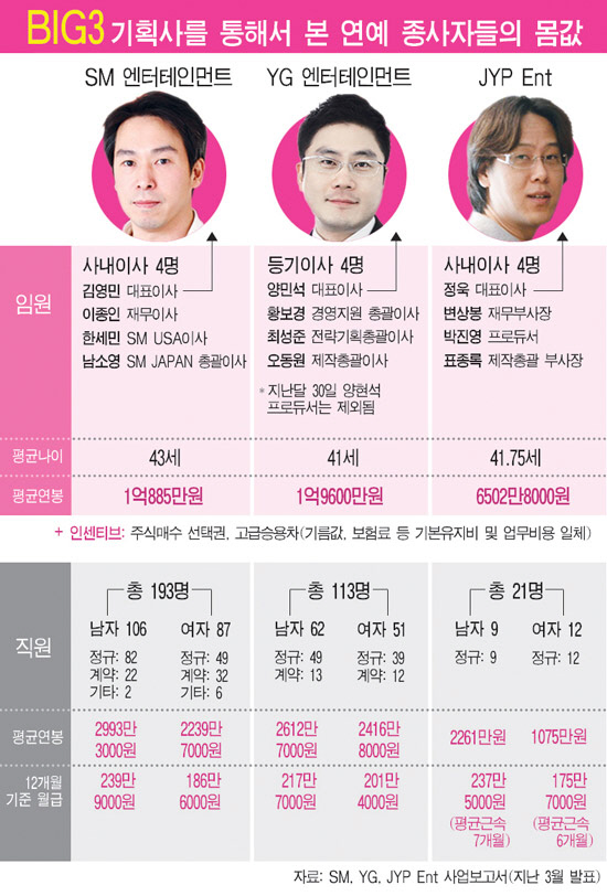 따라서 빅3 임원진의 평균 연봉순은 YG가 가장 높았고 이어 SM, JYP 순이었다. 이들은 연봉 외에도 인센티브로 주식매수선택권이 주어진다. 또 고급 승용차를 비롯해 기름값이나 보험료 등 기본 유지비는 물론 혼잡통행료나 고속도로 통행료 등 업무를 위해 차량을 이용하는데 드는 모든 비용을 회사가 부담하는 등의 혜택이 따르는 것으로 알려졌다.