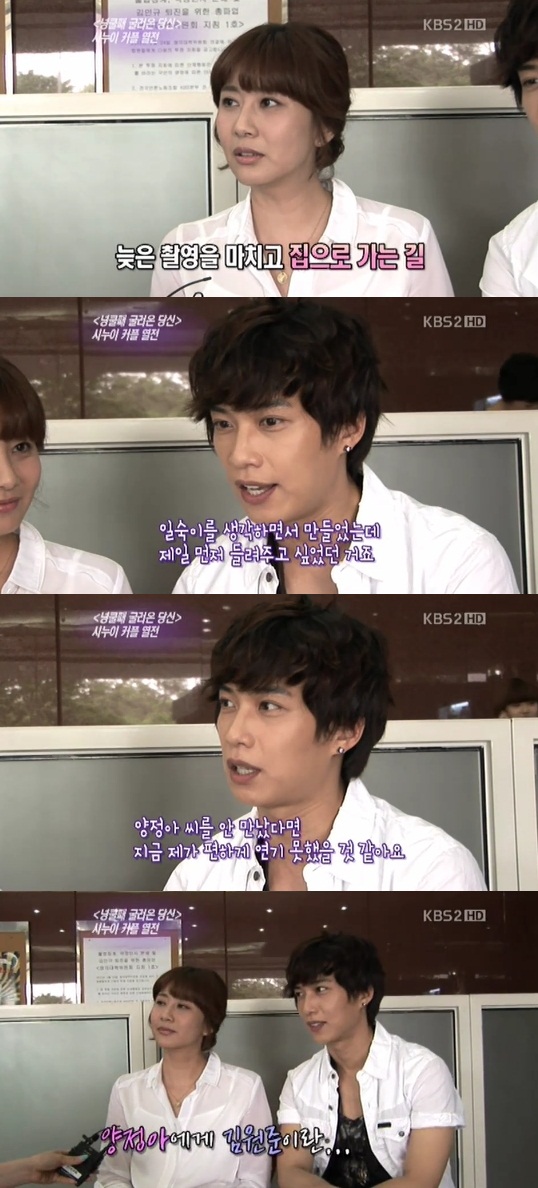 이날 양정아는 "'넝굴당' 촬영이 끝나고 새벽 1시에 김원준에게 전화가 왔다. 그 시간에 자신이 작사 작곡한 곡이 어떻냐고 물어봐주더라"고 말하며 감동받았던 사연을 털어놨다.