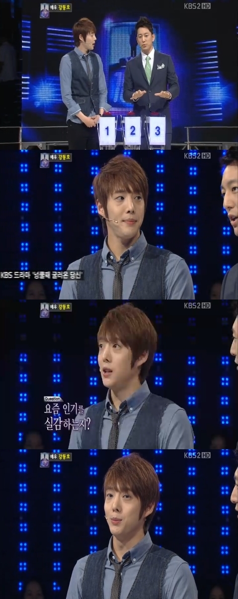 MC 한석준 아나운서가 "주말드라마 '넝쿨째 굴러온 당신'이 시청률 대박이다. 40%에 가까운데 요즘 인기를 실감하냐?"고 묻자 강동호는 "실감하고 있다. 지나가면 사람들이 '강동호 강동호' 이름을 불러주는 분들이 많다"며 웃었다.