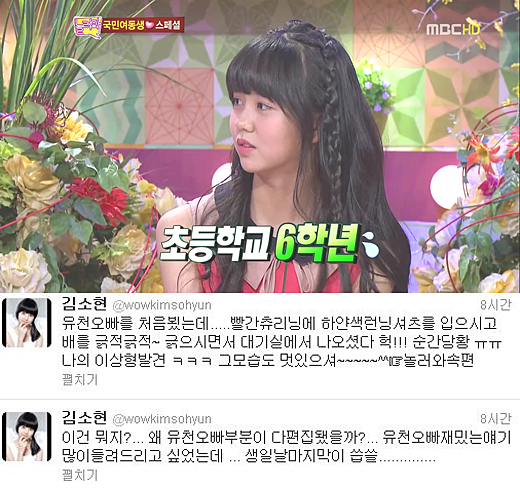 [MBC '유재석 김원희의 놀러와'에 출연한 배우 김소현(위)과 트위터 글. 사진 출처= MBC 방송화면-김소현 트위터 캡처] 기사 제보 및 보도자료press@mydaily.co.kr