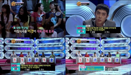 1일 오후 9시 55분 방송된 SBS TV '세대공감 1억퀴즈쇼'의 1라운드 문제로 "아침식사로 먹으면 식욕을 억제해 다이어트에 도움되는 것은 무엇일까?"가 출제됐다. 보기로 1번은 달걀, 2번은 주스가 제시됐다.