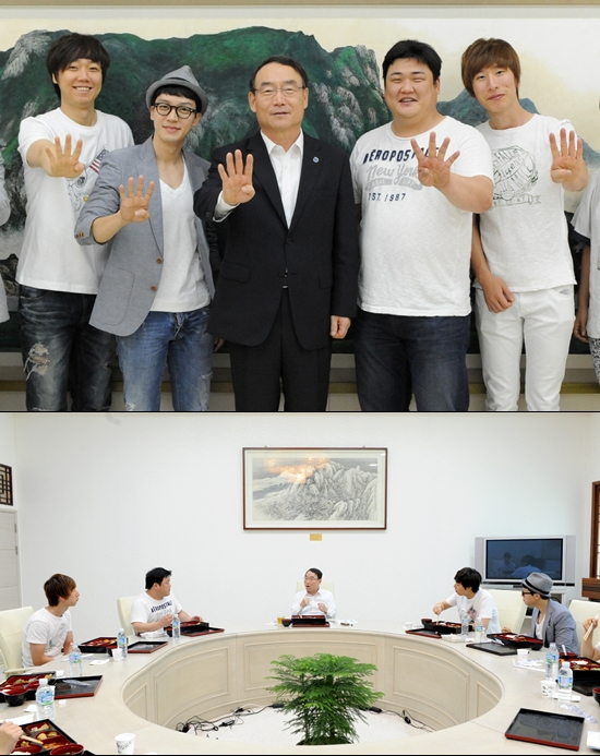 김인규 KBS 사장과 KBS 2TV '개그콘서트' 인기코너 '네가지' 팀(김기열 김준현 양상국 허경환), 서수민 PD, 김영식 PD, 전직국 예능국장이 6월26일 KBS 본관 6층 임원 회의실에서 도시락 오찬 겸 미팅을 가졌다.