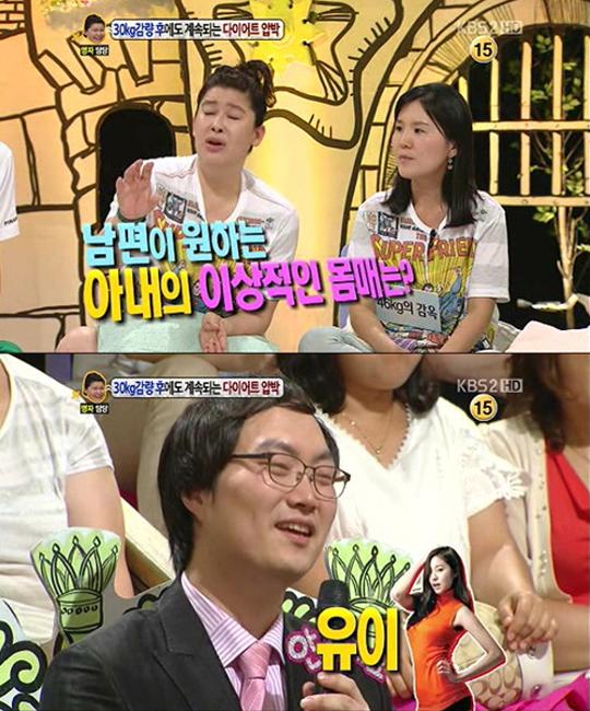 6월25일 방송된 KBS < 안녕하세요 > 에선 46Kg의 몸무게를 유지하라는 남편 때문에 고민이라는 한 여성이 출연했습니다. 남편이 연애시절부터 마른 여자를 좋아해 75Kg체중을 46Kg으로 만들어 결혼했다는 황은미씨는 "결혼한 지금도 46kg의 체중을 유지하라는 남편의 감시를 받고 있다. 매일 배가 어느 정도 나왔는지 남편에게 검사를 받는다"며 몸무게 대한 남편의 기준을 완화해 달라고 부탁을 했고 이에 황씨 남편은 "(애프터스쿨) 유이씨 정도면 좋겠다. 나이가 좀 있으니까 양보해서 48kg 유지해라"라고 답했습니다.