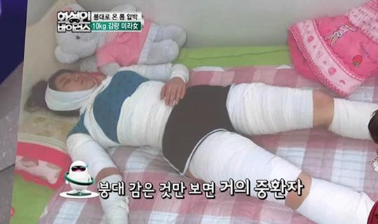 6월19일 방송된 tvN'화성인 바이러스'에는 압박붕대로 얼굴에서 발끝까지 온몸을 감으면서 생활하는 일명 '미라녀'김유정씨가 출연했지요. 압박붕대로 체중 10kg 감량에 성공했다는 김유정씨는 "3~4년간 계속 압박붕대를 감다 보니까 요령을 터득하게 됐다. 살 많은 곳을 세게 감을수록 (다이어트)효과가 좋다"며 다이어트를 위해 몸에 사용하는 압박붕대는 복부 4개를 비롯해 23개에 달한다는 충격적인 설명을 태연스럽게 했습니다.