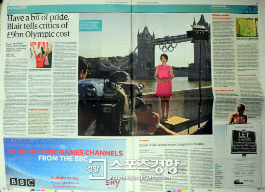 박선영 앵커는 지난 7월 25일 오전(영국시각) '런던 2012 특집 8시 뉴스' 진행을 위해 런던의 대표적인 상징물인 타워브리지 앞에서 섰다. 특히, 이 모습이 26일 발간된 영국의 유력 일간지인 가디언지(the guardian)에 무려 두면에 걸쳐 실리면서 화제가 되고 있는 것.