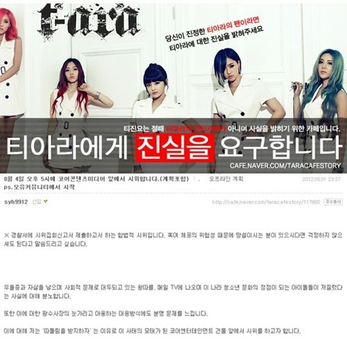 걸그룹 티아라 멤버 화영의 탈퇴와 관련 구성된 '티아라에게 진실을 요구합니다'(이하 '티진요') 회원들이 온라인을 넘어 오프라인 활동에 본격적으로 나선다.