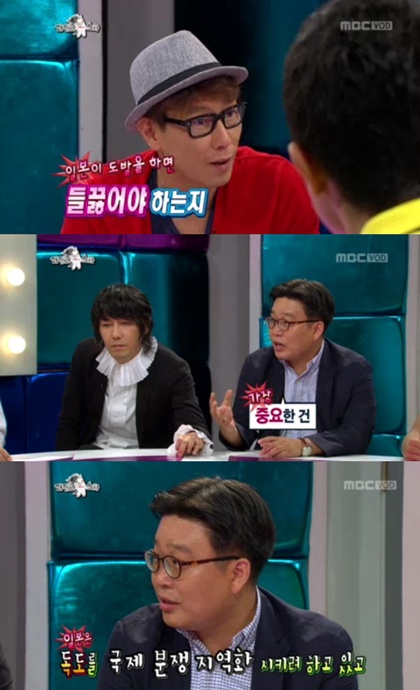 '독도 알리미'로 활동하고 있는 김장훈과 서경덕 교수는 최근 민감한 이슈로 떠오르고 있는 독도 이야기를 꺼냈고, 윤종신은 일본의 도발에 우리도 같이 들끊어야 하냐고 물었다.