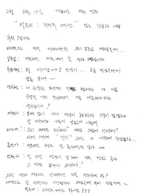 현재 군복무 중인 관계로 영화의 홍보 활동에 참여하지 못해 아쉬움을 달래기 위해 직접 친필 편지를 보내온 것. A4 용지 2장 분량으로 그가 직접 쓴 이 편지는 팬들과 동료들에게 미안한 마음과 함께 하지 못해 아쉬운 마음이 고스란히 녹아 있다.