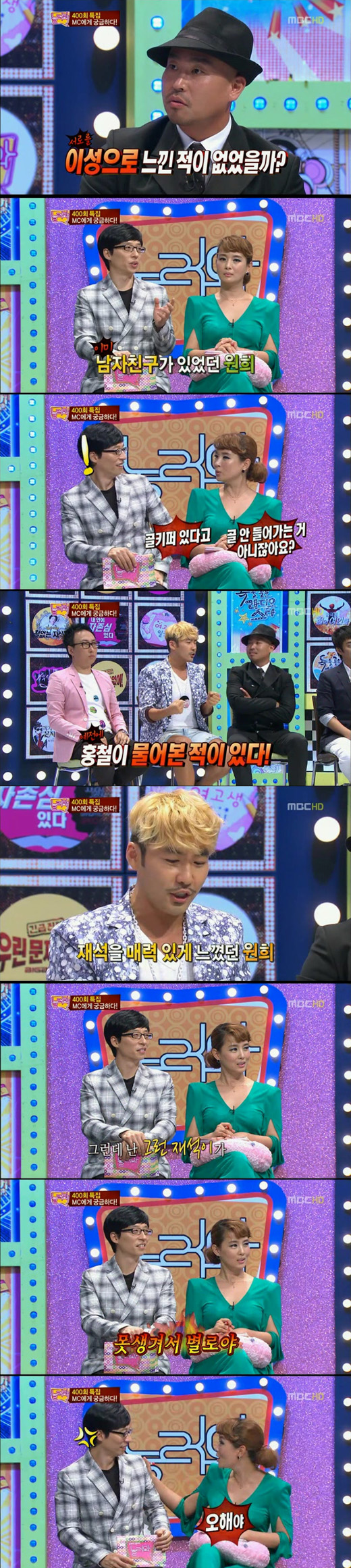 노홍철은 "내가 물어본 적이 있다"며 "김원희가 유재석을 진짜 매력있는 사람이라고 칭찬한 적이 있다. 하지만 김원희가 '난 못생긴 남자랑은 절대 못살아'라고 했다"고 폭로해 스튜디오를 웃음바다로 만들었다.