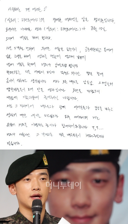 CJ엔터테인먼트는 지난 1일 가수 비(정지훈)가 출연한 영화 '알투비:리턴투베이스'의 개봉을 앞두고 홍보에 함께 할 수 없는 마음과 근황을 담은 친필편지를 공개했다.