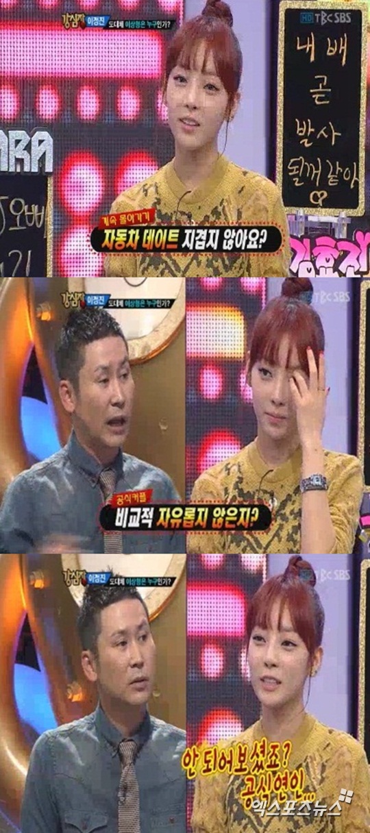 구하라는 "서로 바쁘다 보니 만날 시간을 내는 것도 쉽지 않다"고 하자 장난끼가 발동한 신동엽은 "자동차 데이트가 지겹지 않느냐"며 "공식적 연인이니 당당히 만나는 것은 어떠냐"고 질문했다.