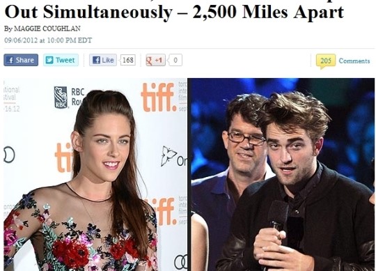같은 시각, 로버트 패틴슨은 미국 LA 스테이플스 센터에서 열린 2012 MTV VMA 시상식에 모습을 드러냈다. 공교롭게도 패틴슨은 스튜어트와 함께 출연한 '트와일라잇' 마지막 시리즈 '브레이킹 던: Part 2'의 홍보를 위해 시상식에 참석했다. 패틴슨은 이 영화에 함께 출연한 테일러 로트너, 피터 파시넬리, 엘리자베스 리저와 무대에 올라 90초 분량의 예고 영상을 공개했다.