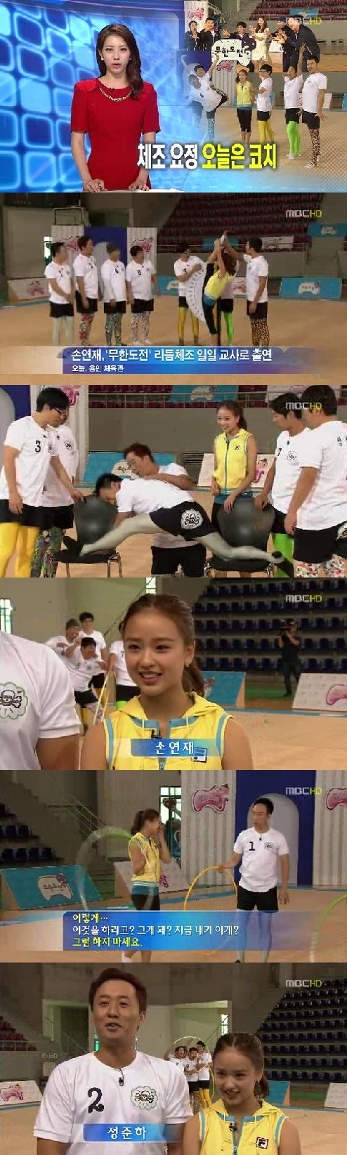 6일 방송된 MBC ‘뉴스데스크’에서는 경기도 용인체육관에서 진행된 ‘무한도전’ 손연재 편 녹화현장을 소개했다. ‘무한도전’ 멤버들은 해골 무늬 티셔츠와 각양각색 쫄바지를 입고 손연재와 함께 유연성 대결을 펼쳤다.