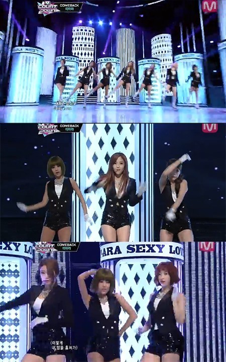 티아라는 6일 방송된 '엠카운트다운'에서 신곡 '섹시 러브'와 발라드곡 '낮과 밤' 무대를 꾸몄다. '낮과 밤'으로 차분하게 시작한 티아라는 '섹시 러브'를 통해 각자만의 섹시미를 발산했다. 일곱 멤버들은 타이트한 의상을 입고 로봇 춤을 추며 아찔한 매력을 자랑했다.